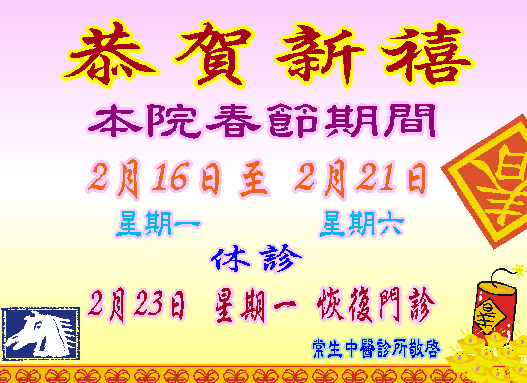 恭賀新喜! 春節期間 2月16日(一)~2月21日(六) 休診,2月23日(一)恢復門診 ^^
